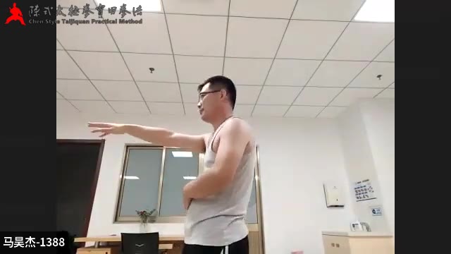 23:42,“大家都以为手往前推有劲,实际上后面往后走、往下走,有劲”。往后往下,在人体上要实现,就要做螺旋缠丝,落到后脚上,后脚和前手对上。任何时候手不要往前推。前次课上陈老师让大家推墙上练习,手让墙固定。45:10“推手的时候本能是往前,通过练习往后往下,身体后面变成一根直棍了就有劲了”。