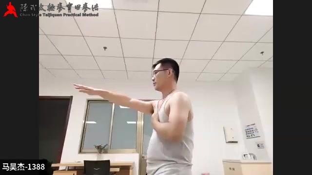 “一定不要按照我的动作去做‘对’它,记住我的步骤就行了。”9:30秒陈老师如此说,并演示了步骤,五个步骤。第一在手肘肩后肩这个面上走一点,在水平面上开前肩三角。第二把后肩去掉,换上膻中,仍开肘肩膻中这个角、开一下肘,把这个N型伸一下。第三加上丹田,再伸一下,往下沉转。第四摸着后大腿内侧,再拉一下,最后摸后膝盖往外再一开。五个步骤。陈老师说,只要你动作包含了以上,做三个步骤也可(动作包含在里面没遗漏)。