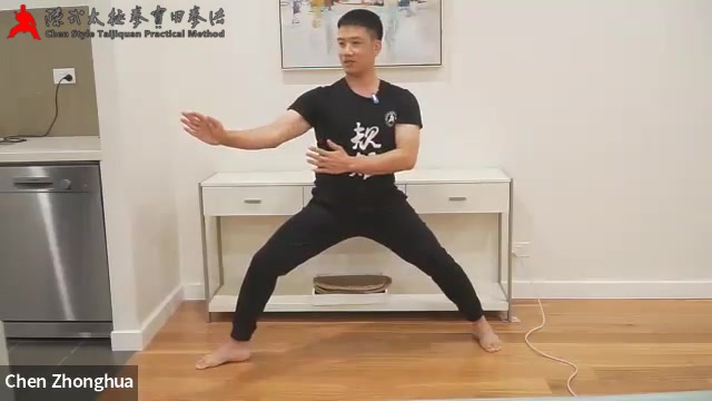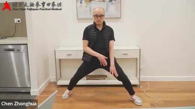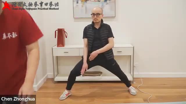 陈老师演示:两个大腿站好马步不动,像水泥桩子被埋进了地下一样,大腿也动只在中轴不晃的前提下转腰就可以了。转左右脚跟起,反之相反。