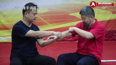 实际上先练什么呢?为了身分阴阳,先练关节。我们今天做这些作,它都是关节。说练关节是什么意思?你抓住我小臂你看,你看大家都看到了,如果走这,这是块骨头。你看,这叫走骨头,它这个不行。怎么办呢?他已经抓住了,抓住很好,我还想抓你呢?你看吧,多厉害!我这个胳膊能抓着他手!你们看见了吧?