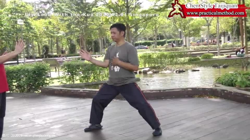 讲了正圈的定式后,上身(手,前肩、后肩)定住锁在一起不动,用前胯领劲往左转。有视频。