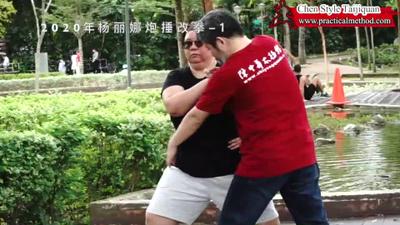 陈老师:所以你看。他有这个。但并不去。这么高。就是你感觉出来。你碰我。你试,翻过收来了。是吧。他不是,不是这样的。走。走。唉。唉,这还是一个意思啊。做的时候啊。一定在这。手没有动作。嗯。好。闪通背,好。好。好。唉,大点。走。唉。不要动啊。这得在。整整在一条直线上。