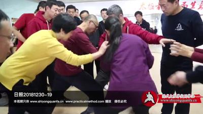 陈老师:劲在这吧,要不在这儿,要不在这儿,就差这儿一。就恰到好处等于正好无过不及嘛,要不你就过来,要不你就无及。你看,推,是不在你背上?你再来!过来了。练拳就是后来,找着那个位置了。就你站不住那位置