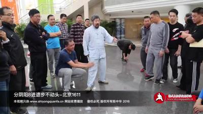 5分40秒的时候,老师让学员把膝盖定住进行动作示范,正常的是进不去的和推手是一样的,定住膝盖进脚,再堵脚进膝盖,一步一步地往前平移,就像一个杠杆一样,有个支点一步一步的撬过去,对方是顶不住的。