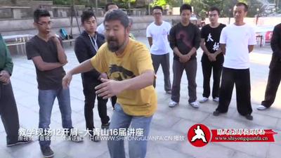 3分25秒钟-陈老师和陈旭教练开肩,这个动作和81式里面退步跨虎是一样,肩的连接点,身体的那个点不能动,肘从小外面画个圈,大臂的那一头转,只有一面定住,一面在转,才能分开,动作要大。