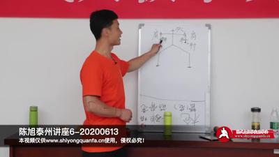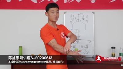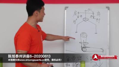 陈旭教练:不是往下走,就是这个劲,它为了不往上走,它就是必须往下走才行,就它,是这么逼着它往下走的,它是另外一步了,它另外一步。第一步先练肩,第二步练这个肘这个位置。嗳~它是在界底下这麽走的。