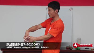 陈旭教练:手腕,这里就行了顶住!从这个位置啊,这样你看,这个位置,它这个劲儿,往这打的时候它不能动,它是通过这位置打那儿去了。它这个地方这麽多转个圈打那去了,感觉到吧?