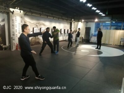 1.右脚落地,左脚起。右手正圈(领对方),左手反圈(推后背),定式右上左下,左脚后深插-弹,双手与后脚对开,一气呵成。