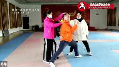 林宏凯,开始吧,慢点练。好,可以,动作都会了。我再说一点啊,我们通过动作来讲一个理论,理论有很多种,综合起来还需要时间、还需要练习的遍数。林宏凯注意看,说一下手和肘的关系,开的时候要用手领出去,手和肘的关系一定要明确,出手、回肘、再出手,开的时候,手上动作是17/20,回的时候,肘上动作是17/20,有个比例。就是出的时候手上动作大,回的时候肘的动作大,然后打完。