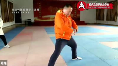 刻意用力反而没有力,你自己感觉用了很大力,其实没有力,这个力都在自己身上。通过练习,把身练开了,把关节每个位置调整对了,它出来力,和对方发生了间接力,不是直接力。然后出去、打完,动作再清楚一点,回肘、打开、脚、拉回来、提腿、落脚,一动一动练,不光手上一动一动练,腿上也一样的,腰要控制胳膊、还要控制住腿。好,就说这些。