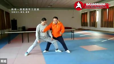 我再说一下吧,练拳第一步先自己会,你像刚才刘霞继自己练得非常好了,第一关已经过去了,第二步是用法,需要有人。那我们第一关还没到的时候,要想第一关,这些动作都练好了,都有了,然后才能进第二步。听老师课一年了,但是套路还没会,现在我们先把套路的样子练出来,基本功的样子描下来。我们实用拳法练到最后是从里边、从下边走,但是初练不要考虑这些问题,因为真正练到里面、练到下边,没有十年功夫出不来,我们教练现在练也是模仿一点。