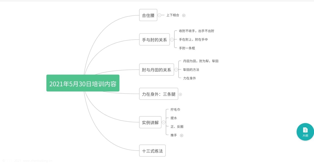 通过本次学习,明白了上下合住的重要性,手与肘的关系,肘与丹田的关系。以后盘架的方向就是在盘架时找到并体现出上述关系。