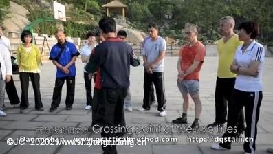 陈老师:这不复杂,三股力还复杂么。你也没有这三股力的话,你就是就是,你就是这么一使劲儿这么一使劲儿。你看这一个,感到这个劲儿了吧。在这同时我差下去一个。你试。这是两股力吧。所以在这个同时你看,一往这走。二往这走。往这走的是这么斜着,这个是这么往下斜的。(英文)随便推你试。你看这样。这是一股力吧,两股力。这是第二。