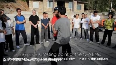 0:40 两条线是右肘到左脚,右脚到丹田。相交点在身体前面。看不到的,多看几次,就会看到的。