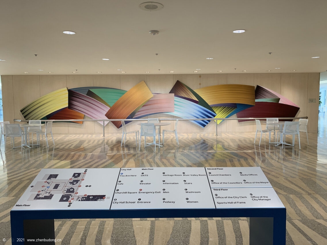 这个市政大厅是我从里贾纳搬到埃德蒙顿后多年才筹备建设的。做计划的时候我已经在里的很近的维多利亚艺术学校教书。设计是由当地最著名的建设师做到,那个建筑师的儿子还是我的学生,并且1997年还跟我去中国做文化交流,后来他去了纽约最著名的建筑学院。据说他父亲给那个学院捐了很多钱。