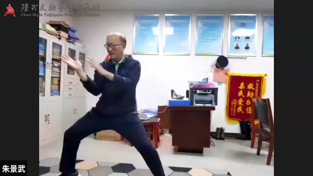 第三式六封四闭,胳膊不动,躯干往下落,右腋窝打开,落完不要站起来,同一高度转到四十五度,右边儿身体不动,左边儿转过去,不动的轴在右边儿,上步身体不要松开,同一状态下。