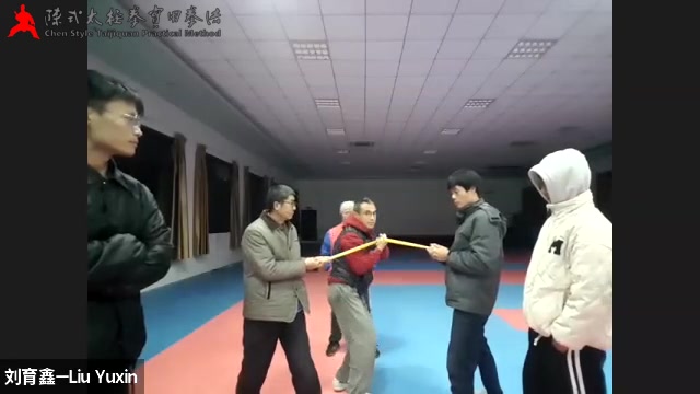 两个动作练习,定住两头走中间,前手和后膝定住,走肘和前胯;定住中间走两头,定住丹田,前臂逆缠,后胯往前往下转,后膝转着往后往下落,前后对开,螺旋缠丝S线。用橡皮筋展示。