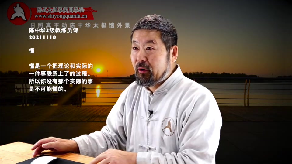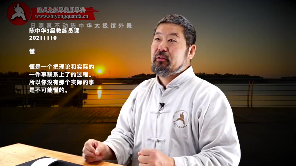 陈中华老师:谁知道听懂了什么意思。水平的提高啊。就是我没说一句话,庞朝立能想一想。啊。推手的时候真是这样。他就能重复出来了。你们没有那个经历。我说的话,你挂不上。就是对不上是怎么回事儿。你只是从。从理论上。作为一个知识的人。这个事儿看过读过听过。你以为懂了。真懂了就是。我说的事儿。你真挂到了一个实际的事儿上。