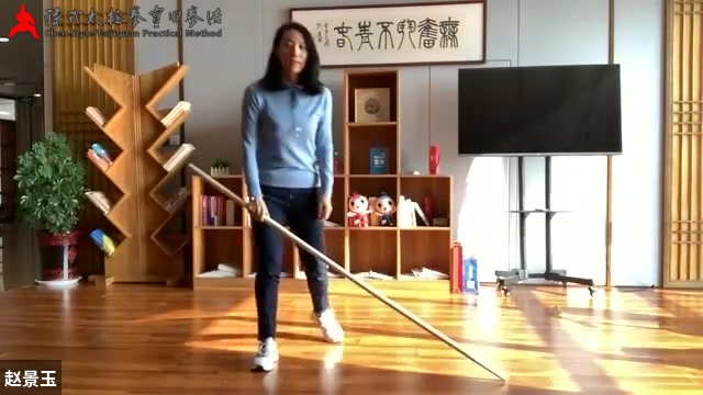转时,定住中轴,脚扎住根以后,使劲顶百会。只有力扎在地下,再完全分配到两脚上,才能把中轴顶直。肩不动,只走胯。