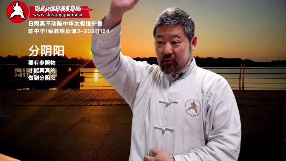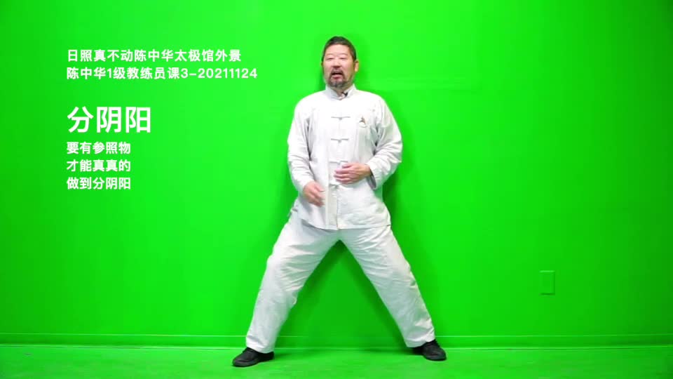 阴阳是什么。身体分阴阳的第一步先分两个。把身体分两个。我分的是怎么样呢。就把头和躯干,和腿都钉在一起。就只动一个胳膊。在我这刚才的演示,就是右胳膊。右胳膊做的时候,身体所有的右胳膊之外的东西,都是固定住,一动也不动。我就是偶尔得晃了一下头。因为这个眼睛和头,和人说话的时候这种交流。也是个坏习惯。你。