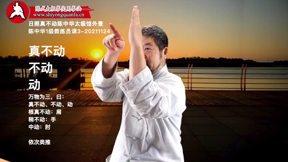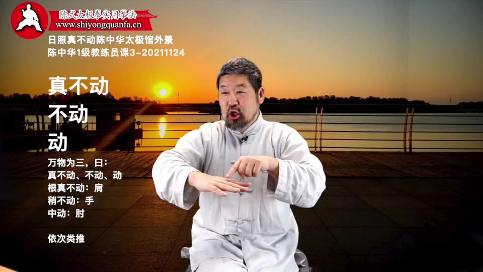 陈中华老师:知道了阴阳里面呢。回过头来再给贾正民说。这个,分阴阳呢。一个关键的问题就是一定要知道有个三。这个三呢,是什么呢。一和三是有作,是真,真实的东西。二是什么。二是一个辅助的东西。这个肩不动。不动的东西就是根。我们数的时候,从根数到梢。从根节数到稍节。所以你的肩是一。然后呢。你肘是二。然后呢。这个手是三。