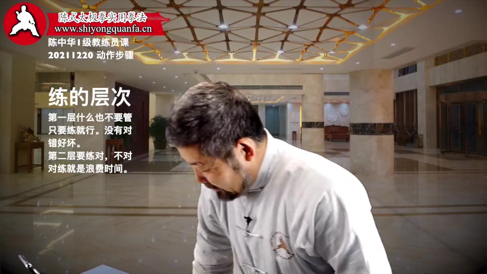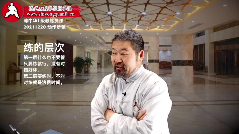 陈中华老师:练拳主要的就是,把身体习惯改过来。改不过来习惯。你练啊。就是说。这个东西我说的话,是有层次的。什么意思。对初学者来说。只说那个大头。大头是什么。就是你别管那些理论。你别管对错。你去练就行。就是练。比不练好。但你已经养成了练得习惯了。就变了第二个层了。第二层就是,你练对了,和不练。和练得不对。