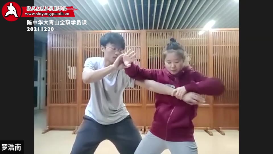 一、二人配合练习护心拳,对方肘打胸,我打他大臂,顺着对方动作把他的胳膊捋直了,要不他还能协调,左手往上拉,右手直落,不转,只走上下。