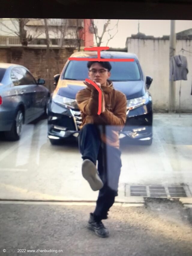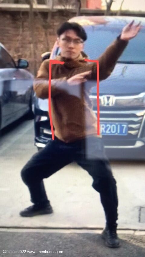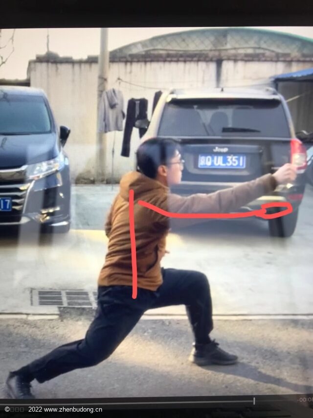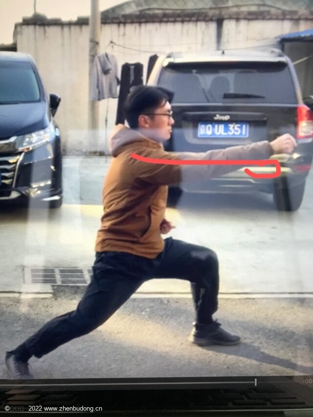 视频16秒:臀位下落了。要填左胯,收肘合丹田,不是靠身体坐下去把膝盖顶起来,身体高度应该是不变的。右手伸直。
