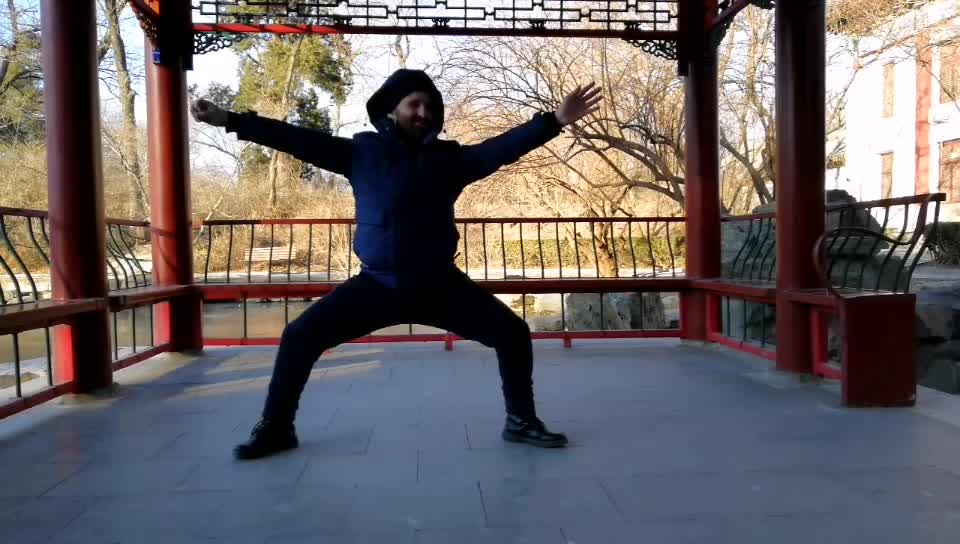 这是拦擦衣2、3的过渡动作。右脚不能开,两脚平行,是个小马步。