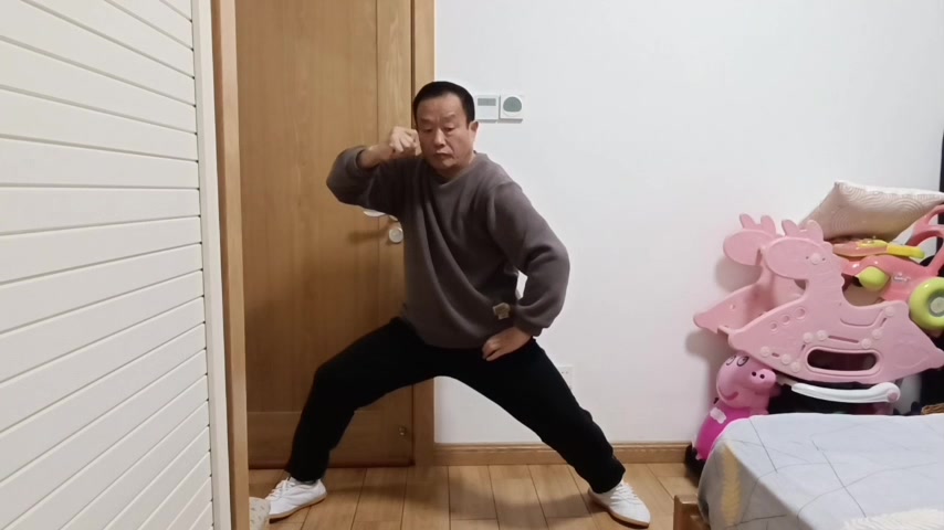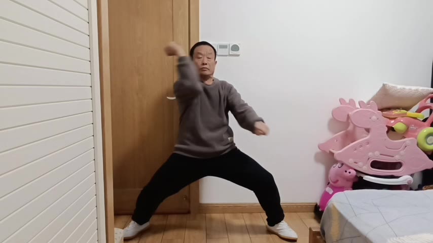 | 陈中华太极馆多伦多教练、青山教练何家伟评语: 整体动作不错。十字手定式时,两手应在丹田前。庇身捶收肘时,要定住肩。现在阶段,你收肘时,耸肩了。做双圈时,也要定住两个膝盖。最后定式时,左膝盖后面的窝要撑开,左膝盖尽量向上。 | ||||||||||||||||||