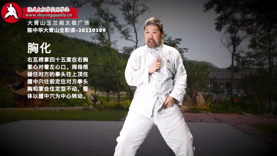 右瓦楞掌四十五度在右胸掌心对着左心口。拇指根碰住对方的拳头往上顶住膻中穴往前定住对方拳头胸和掌合住定型不动,整体以膻中穴为中心转动。