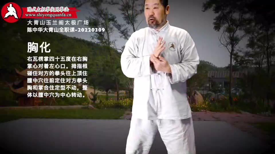 陈中华老师:就是这个手这么一拉它的时候。它跟着一进来。正进来这。一进到这的时候。这不就是这样么。就这个手。把它拨到这去。就这个动作。你是怎么样呢。它一过来之后。你这个地方想跟着跑。你是这么走的。不管怎么样。你要往下落。往下落那个力到脚底下去。这个样。你才能。反复这么练。练得你的有劲儿。脚底下有劲儿。对方一碰这。
