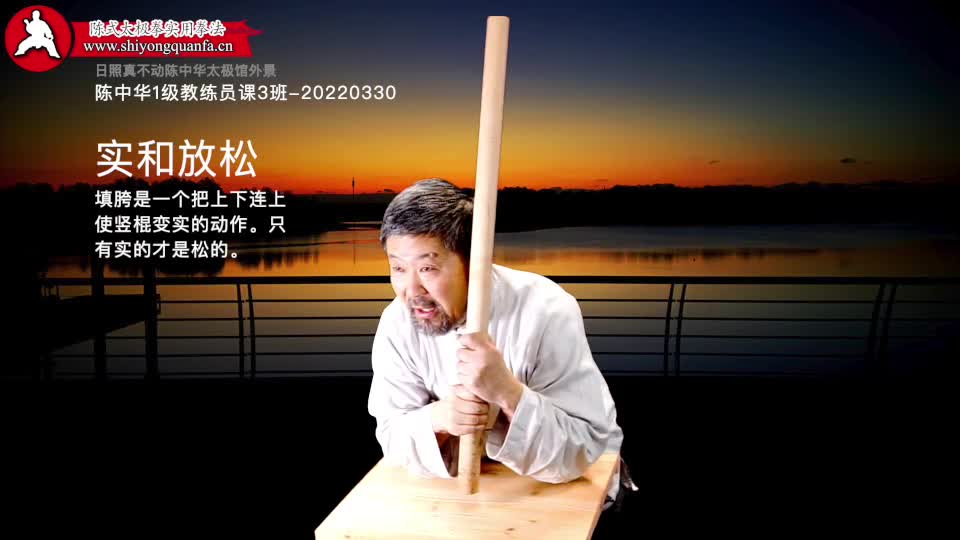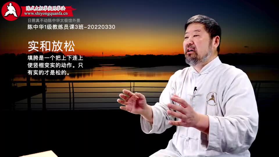 实和放松-陈中华1级教练员课3班-20220330。填胯是一个把上下连上使竖棍变实的动作。只有实的才是松的。