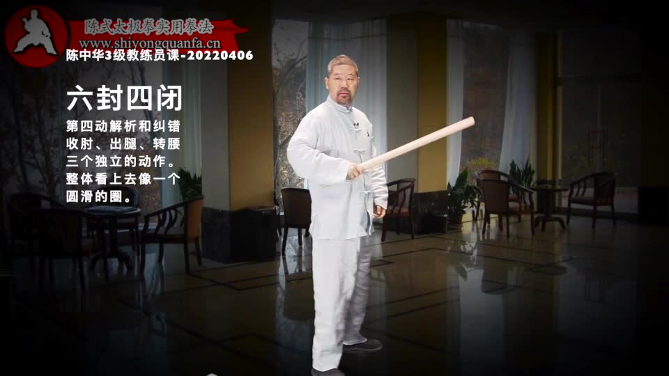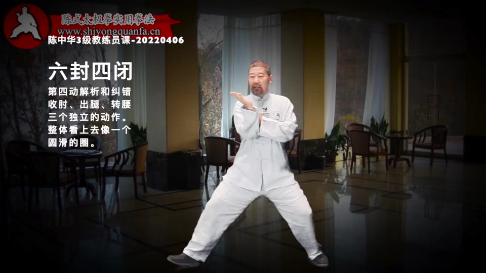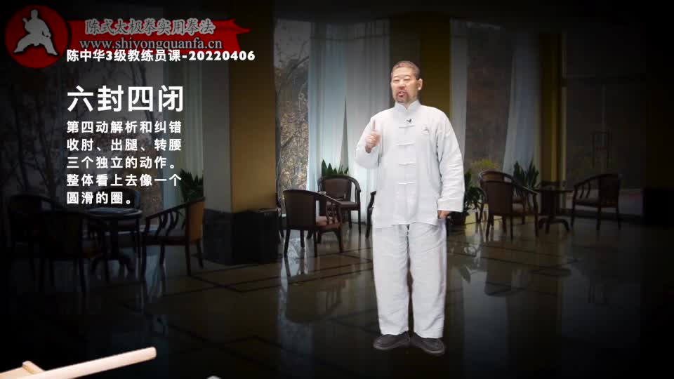 六封四闭纠错-陈中华3级教练员课-20220406。第四动解析和纠错收肘、出腿、转腰三个独立的动作。整体看上去像一个圆滑的圈。