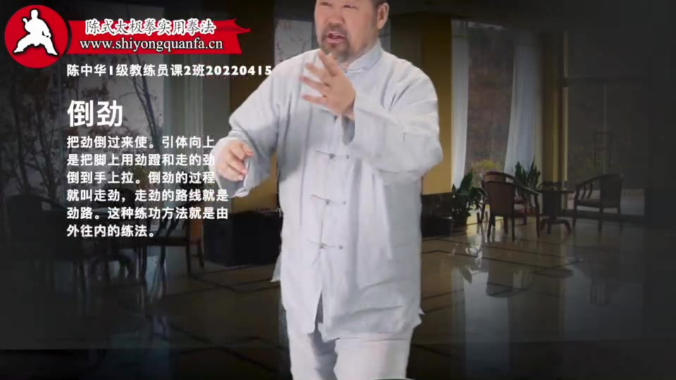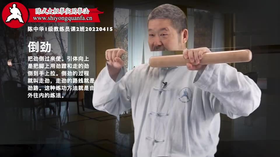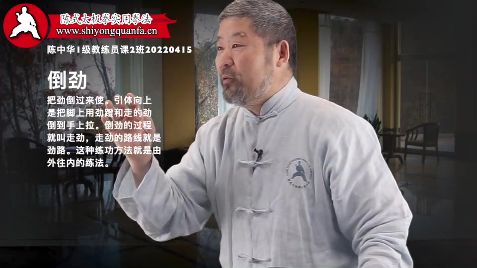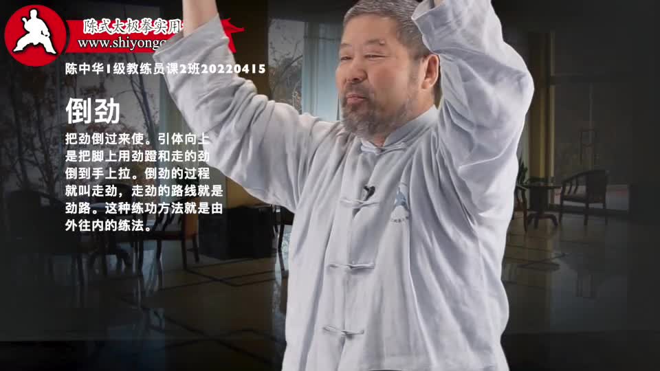 倒劲-陈中华1级教练员课2班20220415。把劲倒过来使。引体向上是把脚上用劲蹬和走的劲倒到手上拉。倒劲的过程就叫走劲,走劲的路线就是劲路。这种练功方法就是由外往内的练法。