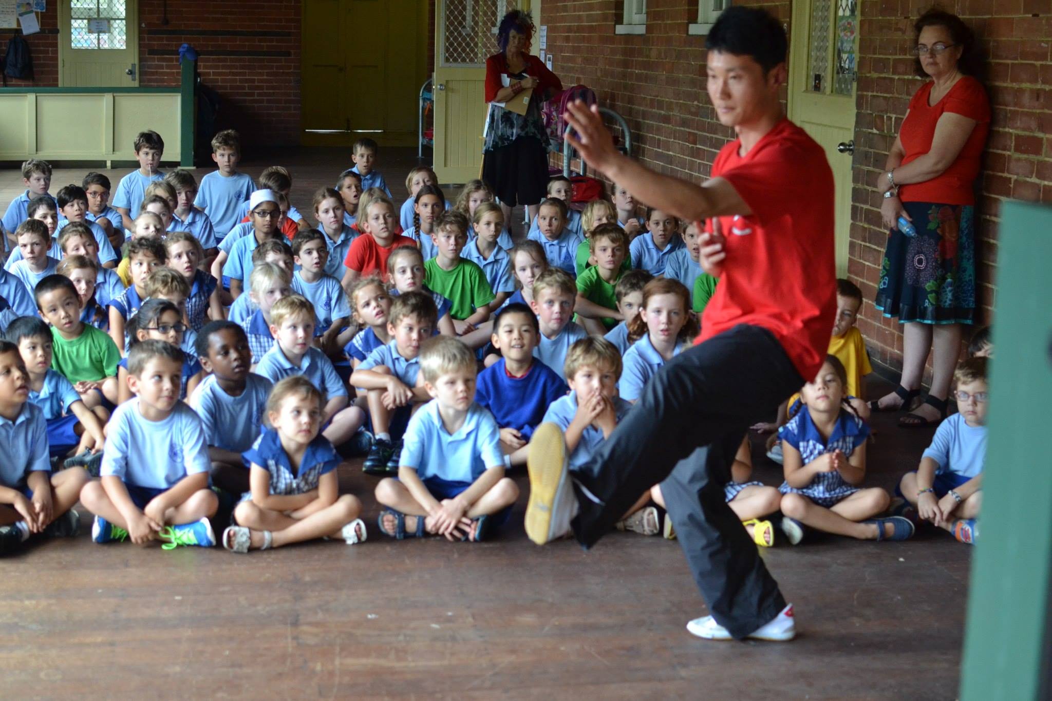 今天在澳洲第一天,中午我跟随萧剑文去了当地的小学,给300个小学生做了表演和教了基本功。
