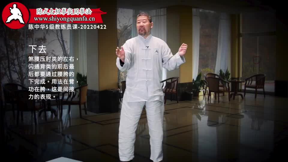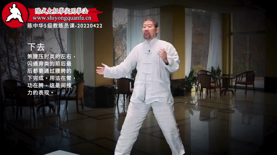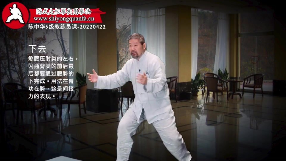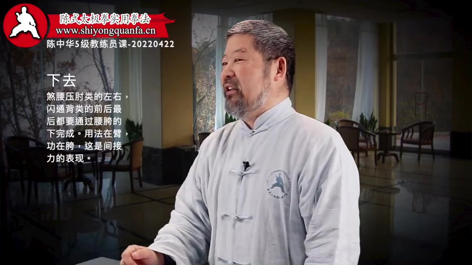 下去-陈中华5级教练员课-20220422。煞腰压肘类的左右,闪通背类的前后最后都要通过腰胯的下完成。用法在臂,功在胯,这是间接力的表现。