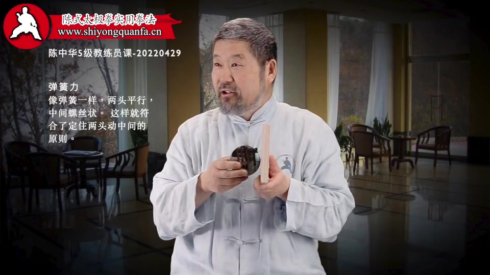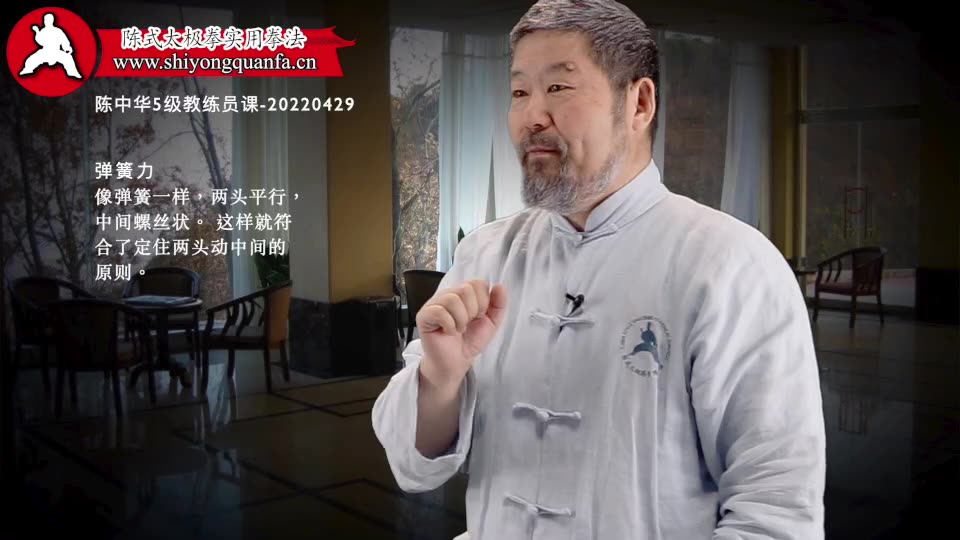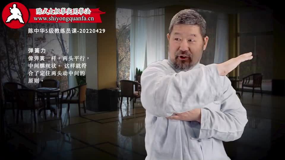 弹簧力-陈中华5级教练员课-20220429。像弹簧一样,两头平行,中间螺丝状。 这样就符合了定住两头动中间的原则。