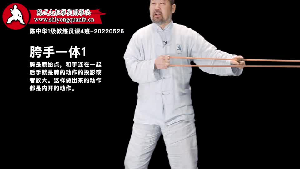 胯手一体-陈中华1级教练员课4班-20220526。胯是原始点,和手连在一起后手就是胯的动作的投影或者放大。这样做出来的动作都是内开的动作。