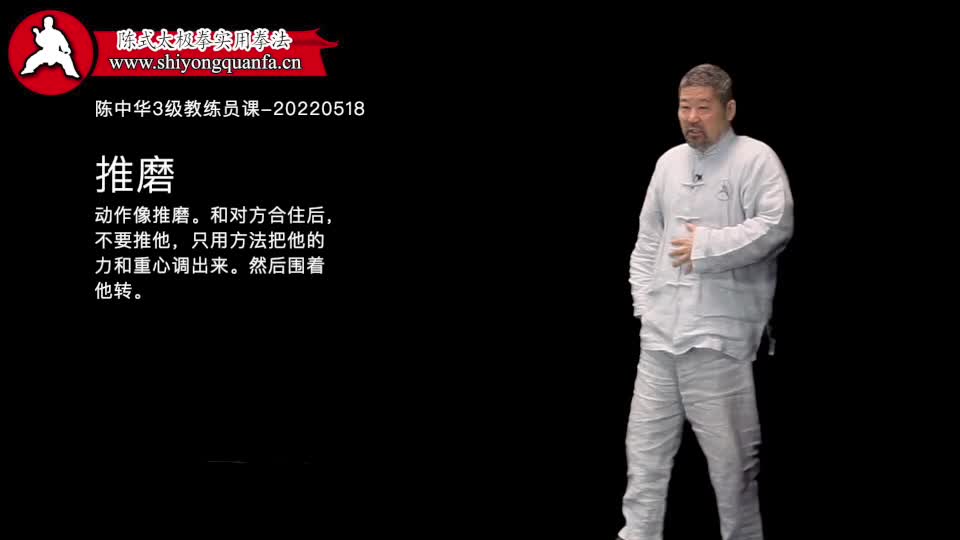 推磨-陈中华3级教练员课-20220518。动作像推磨。和对方合住后,不要推他,只用方法把他的力和重心调出来。然后围着他转。