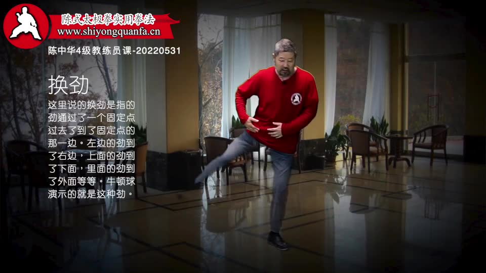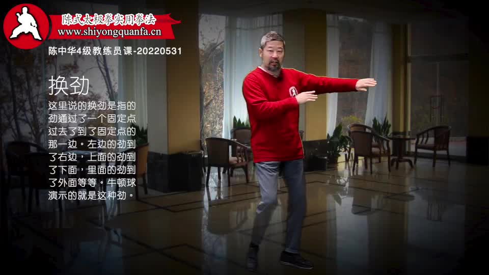 换劲-陈中华4级教练员课-20220531。这里说的换劲是指的劲通过了一个固定点过去了到了固定点的那一边。左边的劲到了右边,上面的劲到了下面,里面的劲到了外面等等。牛顿球演示的就是这种劲。