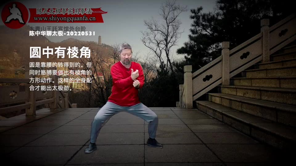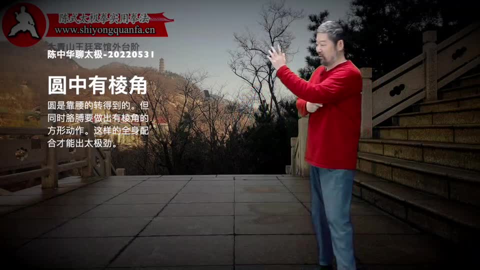 圆中有棱角-陈中华聊太极-20220531。圆是靠腰的转得到的。但同时胳膊要做出有棱角的方形动作。这样的全身配合才能出太极劲。