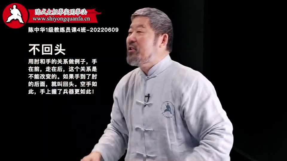 不回头-陈中华1级教练员课4班-20220609。用肘和手的关系做例子,手在前,走在后,这个关系是不能改变的。如果手到了肘的后面,就叫回头。空手如此,手上握了兵器更如此!