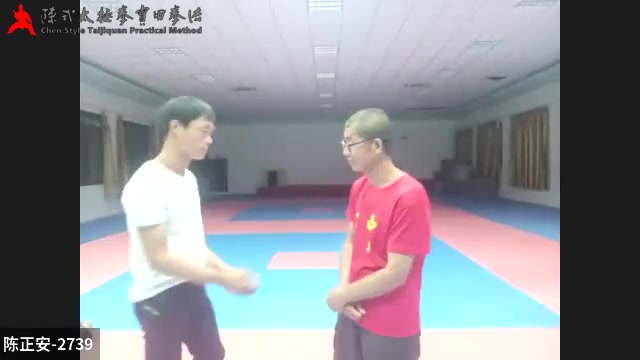 5我(陈老师)和学生推手,一上步,对方就到了,我上步什么也没碰他,就是占位,我占多了,他就倒了。