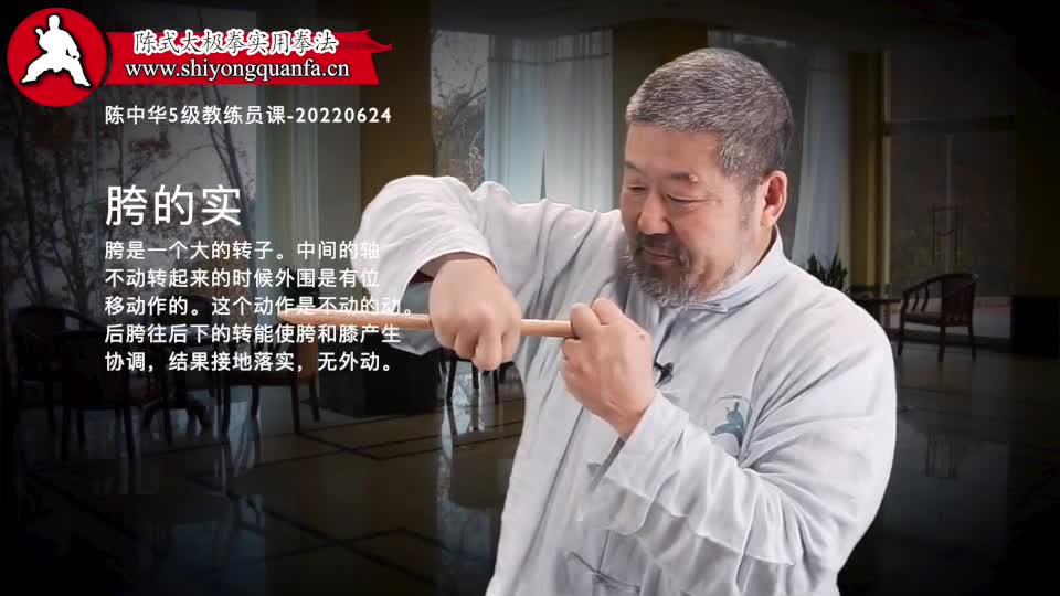 胯的实-陈中华5级教练员课-20220624。胯是一个大的转子。中间的轴不动转起来的时候外围是有位移动作的。这个动作是不动的动。后胯往后下的转能使胯和膝产生协调,结果接地落实,无外动。