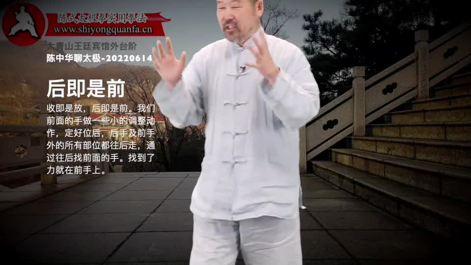 后即是前-陈中华聊太极-20220614。收即是放,后即是前。我们前面的手做一些小的调整动作,定好位后,后手及前手外的所有部位都往后走,通过往后找前面的手。找到了力就在前手上。