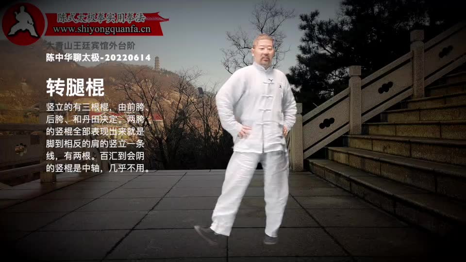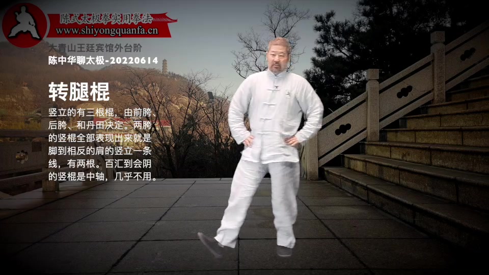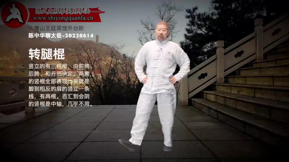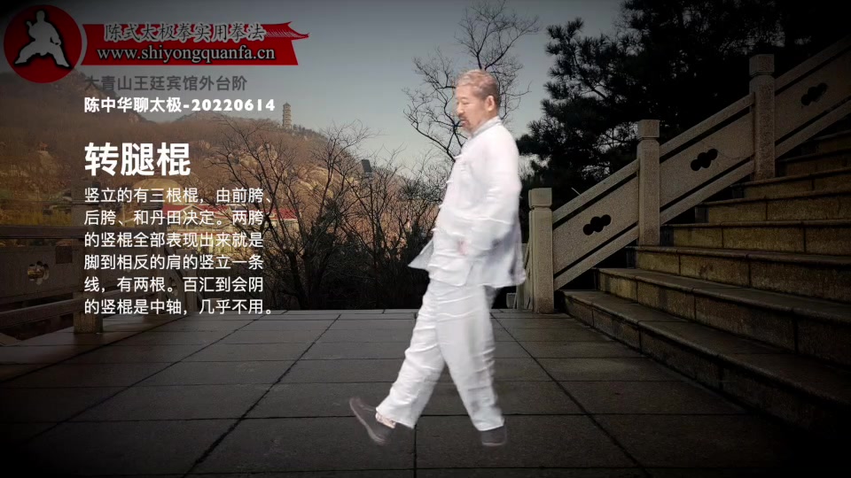 转腿棍-陈中华聊太极-20220614。 用脚后跟蹬地,这个劲顺着腿一直走到头顶(肩膀也可以)。胯的部位是个把手。脚胯头成一根棍。用把手(胯)将这根棍转起来。关键一是膝盖不能弯,二是头不能晃。 竖立的有三根棍,由前胯、后胯、和丹田决定。两胯的竖棍全部表现出来就是脚到相反的肩的竖立一条线,有两根。百汇到会阴的竖棍是中轴,几乎不用。