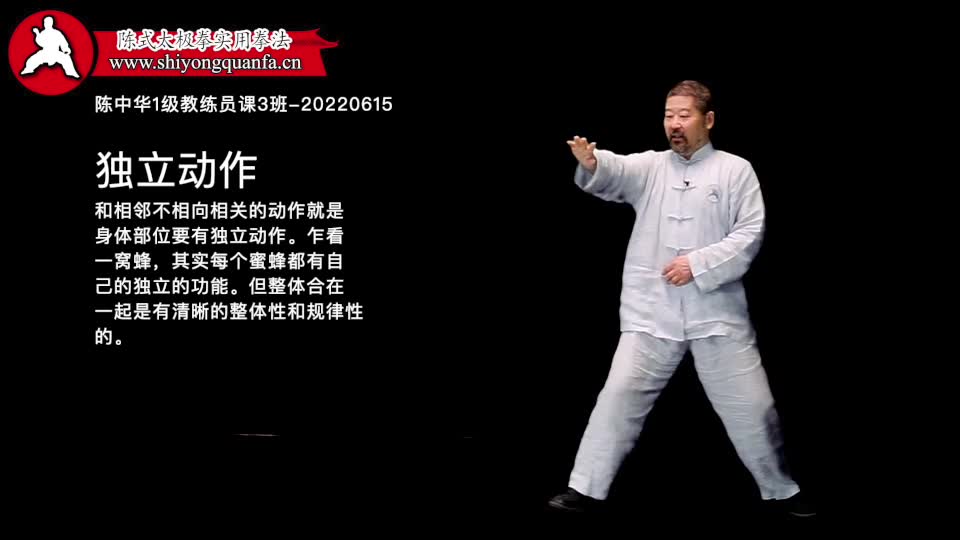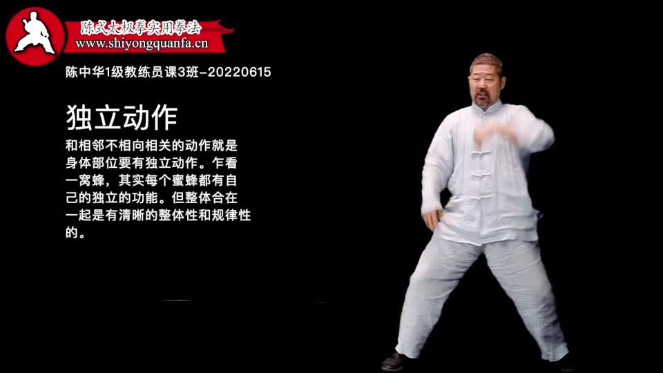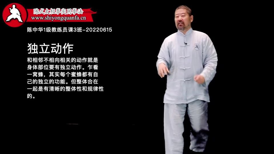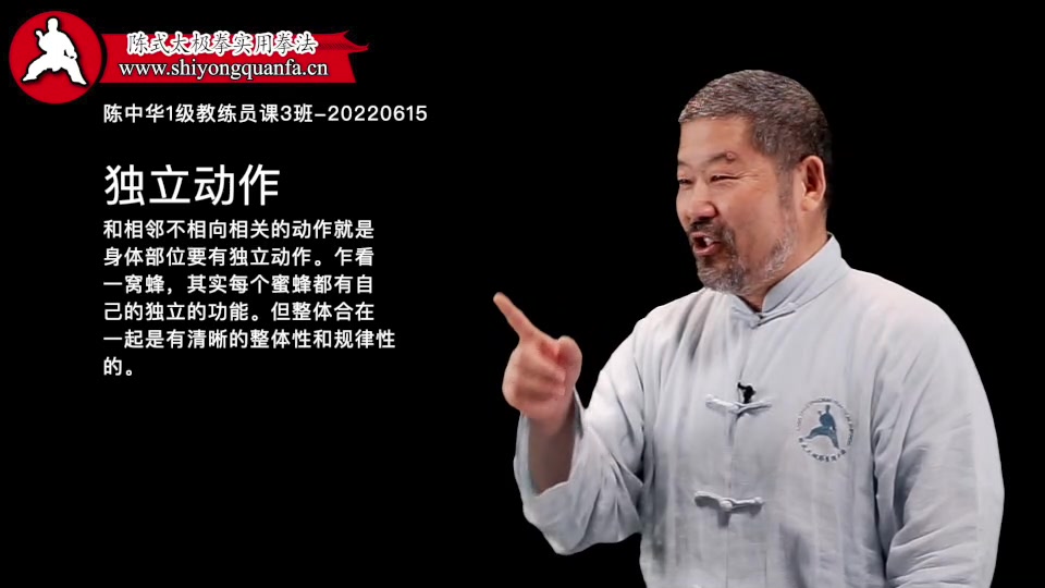独立动作-陈中华1级教练员课3班-20220615。和相邻不相向相关的动作就是身体部位要有独立动作。乍看 一窝蜂,其实每个蜜蜂都有自己的独立的功能。但整体合在一起是有清晰的整体性和规律性的。