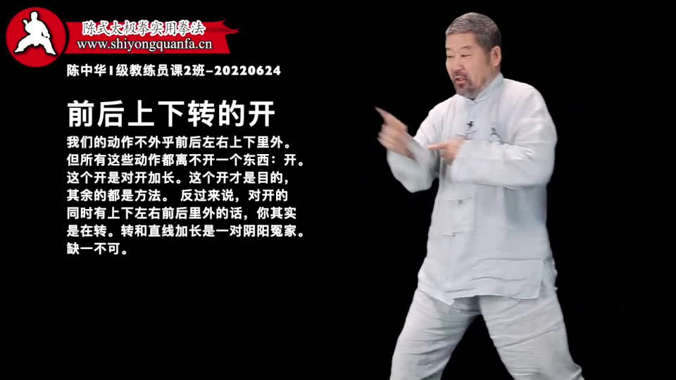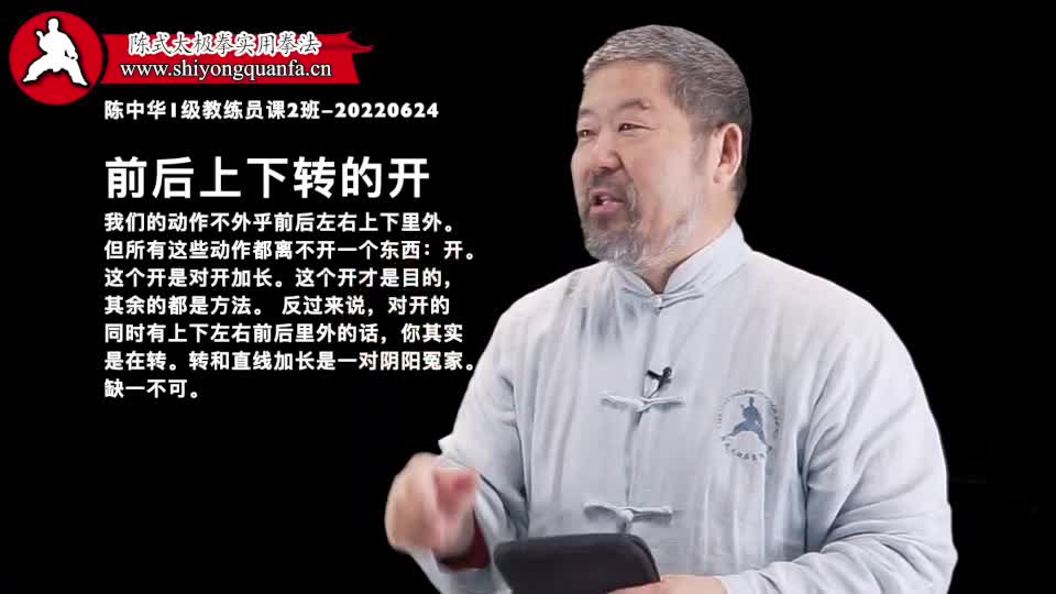 前后上下转的开-陈中华1级教练员课2班-20220624。我们的动作不外乎前后左右上下里外。但所有这些动作都离不开一个东西:开。这个开是对开加长。这个开才是目的,其余的都是方法。 反过来说,对开的同时有上下左右前后里外的话,你其实是在转。转和直线加长是一对阴阳冤家。缺一不可。