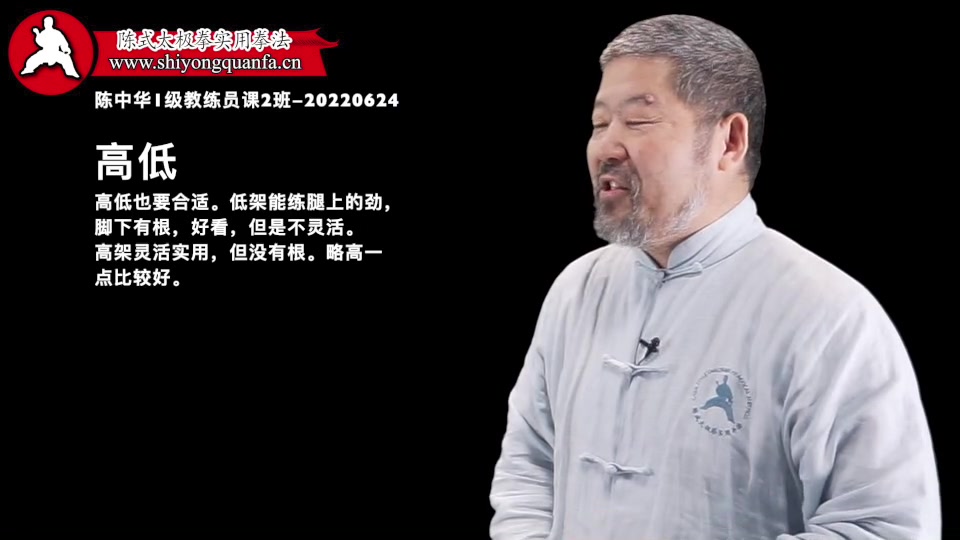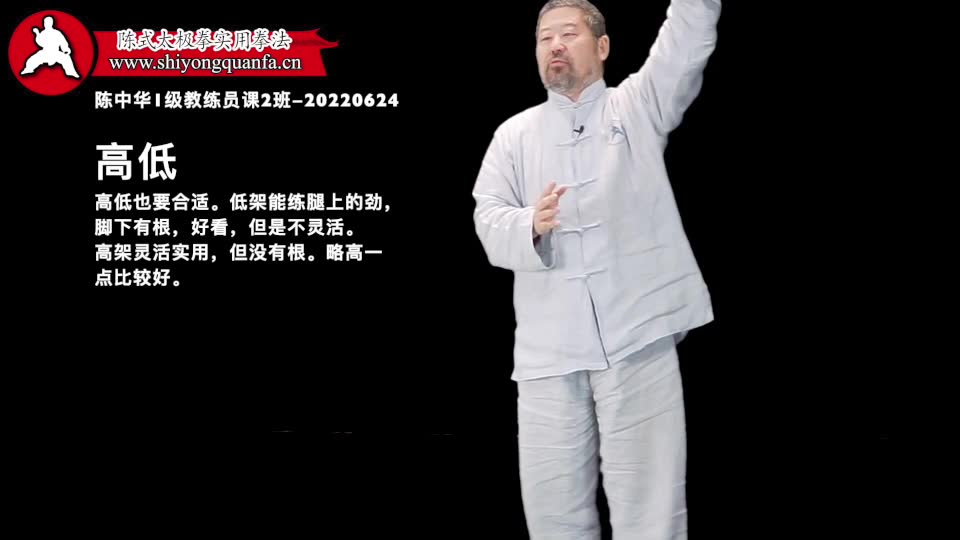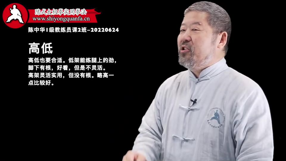 高低的正好-陈中华1级教练员课2班-20220624。站立的高低正好的时候你就能在做填胯动作的时候头往山顶脚往下蹬。否则你顾了一头顾不了另一头。